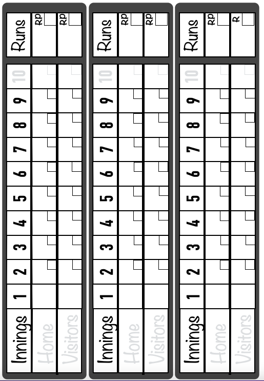 Two players compete to score the highest number of runs over a number of innings. A mixture of card play and 'calls' (e.g. "leave") combine to create many of the situtions in baseball. A base hit is achieved by matching the the boarder colour(s) of the pitcher's card. The colour will determine the outcome.